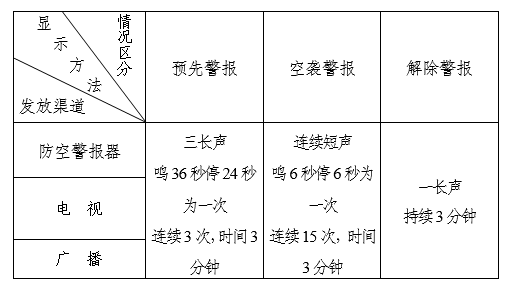 空袭警报:表明敌空袭兵器已临近城市,空袭即将或已经开始,警告人们迅速隐蔽。规定音响信号为鸣6秒,停6秒,重复15次为一次周期,时间为3分钟。