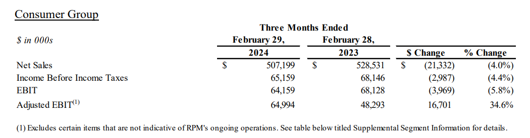 RPM2024 财年销售额创下第三季度历史新高,达15.2亿美元,同比增长0.4%。归属于RPM股东的净利润达到创纪录的6120万美元。所有细分市场的定价均为正,以赶上成本通胀。在那些能够通过工程解决方案满足基础设施、回流和高性能建筑项目需求的企业中,销量增长最为强劲,这得益于项目完工的有利时机。这一增长被零售店的 DIY 消费者外卖减少以及灾后恢复业务的挑战性比较所抵消。