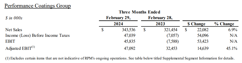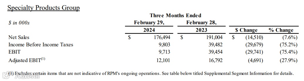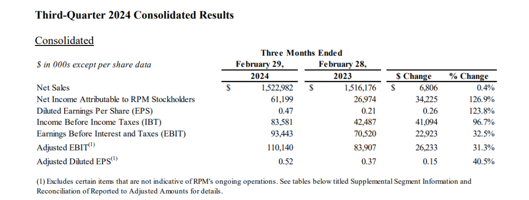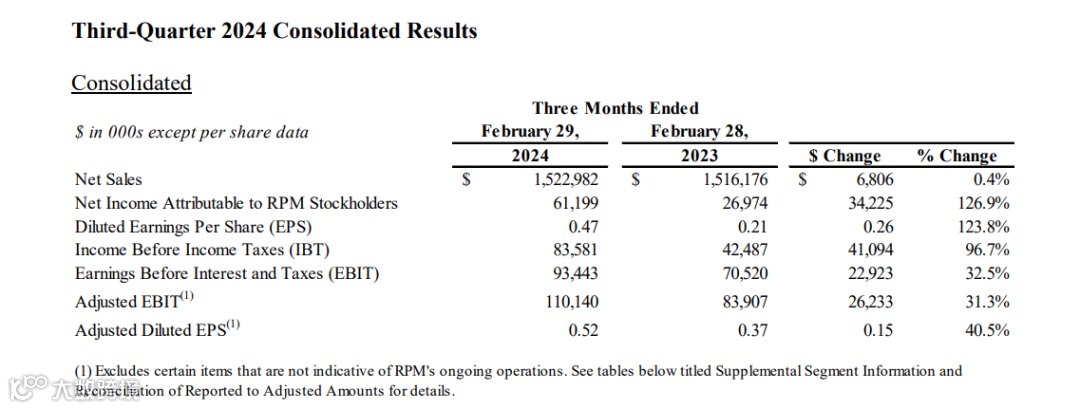 慧正资讯:2024年4月4日,RPM公布了截至2024年2月29日的2024财年第三季度创纪录的财务业绩。