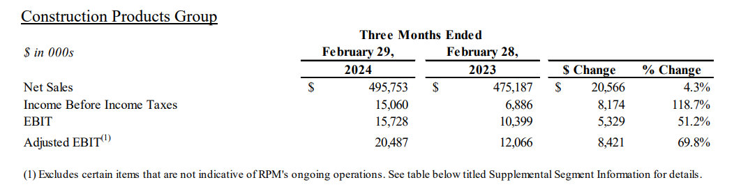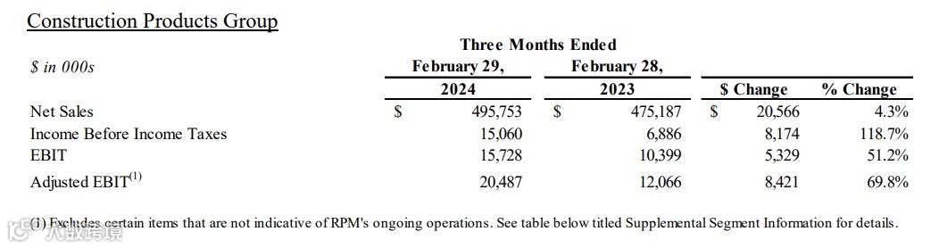 RPM建筑产品集团2024财年第三季度销售额为4.95亿美元,同比增长4.3%。所得税前收入1506万美元,同比增长118.7%。建筑产品集团第三季度的销售额创下历史新高,混凝土外加剂和维修产品表现强劲,这是由于对服务于基础设施和回流相关项目的工程解决方案的需求增加,以及市场份额的增加。服务于高性能建筑施工和翻新的企业也表现良好。在基础设施相关需求的推动下,拉丁美洲的销售额强劲。