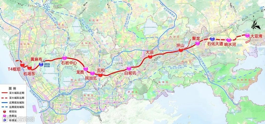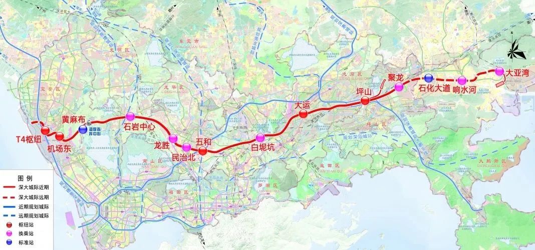 深大城际线路起于T4枢纽站,一期工程止于聚龙站,全长约68.8千米,设站11座,是粤港澳大湾区城际线网的重要组成部分,是深港发展极重要的对外放射通道。