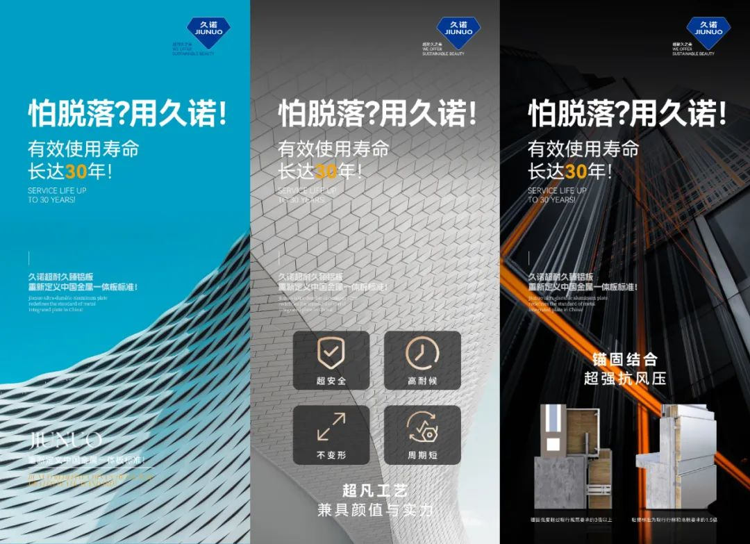 久诺新一代超耐久金属装饰节能铝板作为传统铝板的升级迭代之作,以颠覆式创新的“刚柔并济”产品结构,一举克服传统铝板在使用短期内易变形易脱落的痛点。臻铝板采用0.35mm定制型号铝板,可有效降低金属热膨胀系数高的影响;同时结构中的拒水型高密度硅钙板,密度≥1.55g/cm³ ,因富含2倍增强纤维含量从而不易形成湿涨反应;以定制固体胶层在120℃高温下热复合铝板与硅钙板,胶层极限耐高低温-45℃-170℃;据了解:铝板层与硅钙板间拉伸粘结强度为0.4MPa, 是行业标准要求的2.6-4倍安全余量,避免板材在炎热的夏天发生形变甚至脱落。