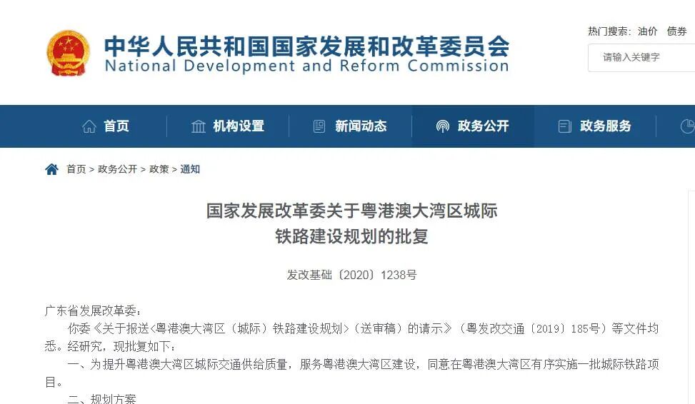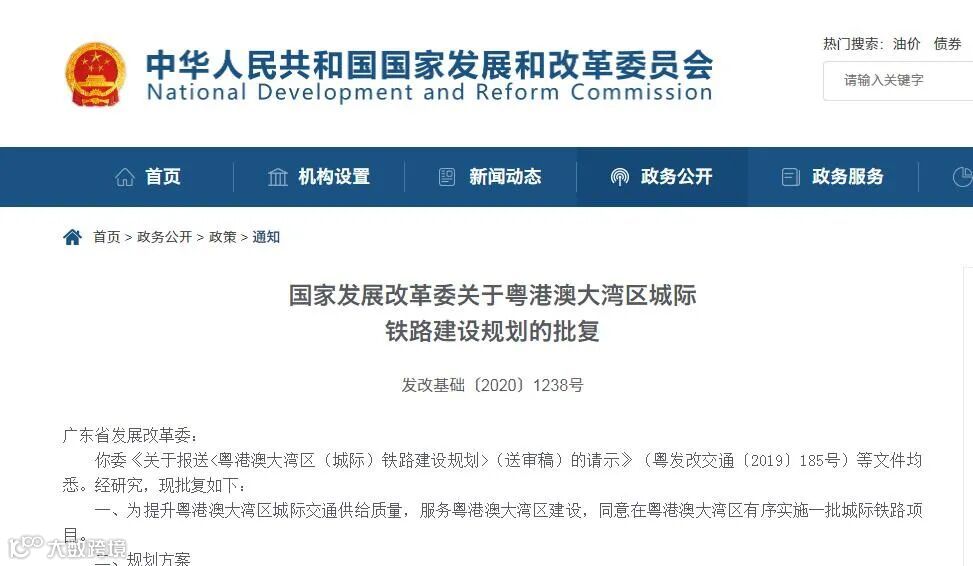 近日,国家发展改革委官网通知显示,批复关于粤港澳大湾区城际铁路建设规划。