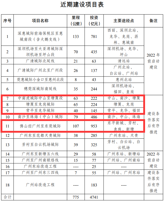 规划建设13个城际铁路和5个枢纽工程项目,总里程约775公里,形成主轴强化、区域覆盖、枢纽衔接的城际铁路网络。其中,2022年前启动深圳机场至大亚湾城际深圳机场至坪山段、广清城际北延线等6个城际铁路项目和广州东站改造工程等3个枢纽工程建设,规划建设里程337公里;待相关建设条件落实后,有序推进塘厦至龙岗、常平至龙华等7个城际铁路项目和广州站改造工程等2个枢纽工程实施,规划建设里程438公里。