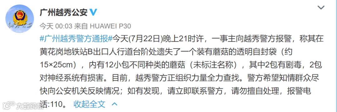 7月22日晚上21时许,一事主向越秀警方报警,称其在黄花岗地铁站B出口人行道台阶处遗失了一个装有蘑菇的透明自封袋(约15×25cm),内有12小包不同种类的蘑菇(未标注名称),其中2包有剧毒,2包对神经系统有损害。