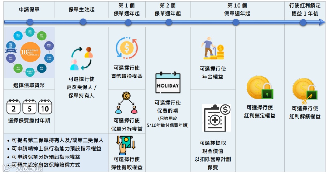 产品支持10种货币转换,包括美元(USD)、港元(HKD)、人民币(RMB)、英镑(GBP)、新加坡元(SGD)、澳元(AUD)、加元(CAD)、瑞士法郎(CHF)、欧元(EUR)及澳门元(MOP),其中瑞士法郎为市场独家选项。数据显示,在美元走弱周期中,持有CHF保单的客户30年实际购买力提升17%,但需注意货币转换成本对短期收益的影响。
