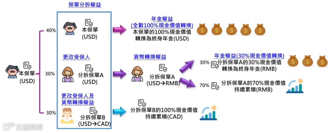 可预先设置最多3名第二保单持有人及3名第二受保人,实现财富代际传承。首个保单周年日起可无限次分拆保单,支持馈赠多位受益人并转换各分拆保单货币。这张图清晰展示了保单分拆的实操路径: