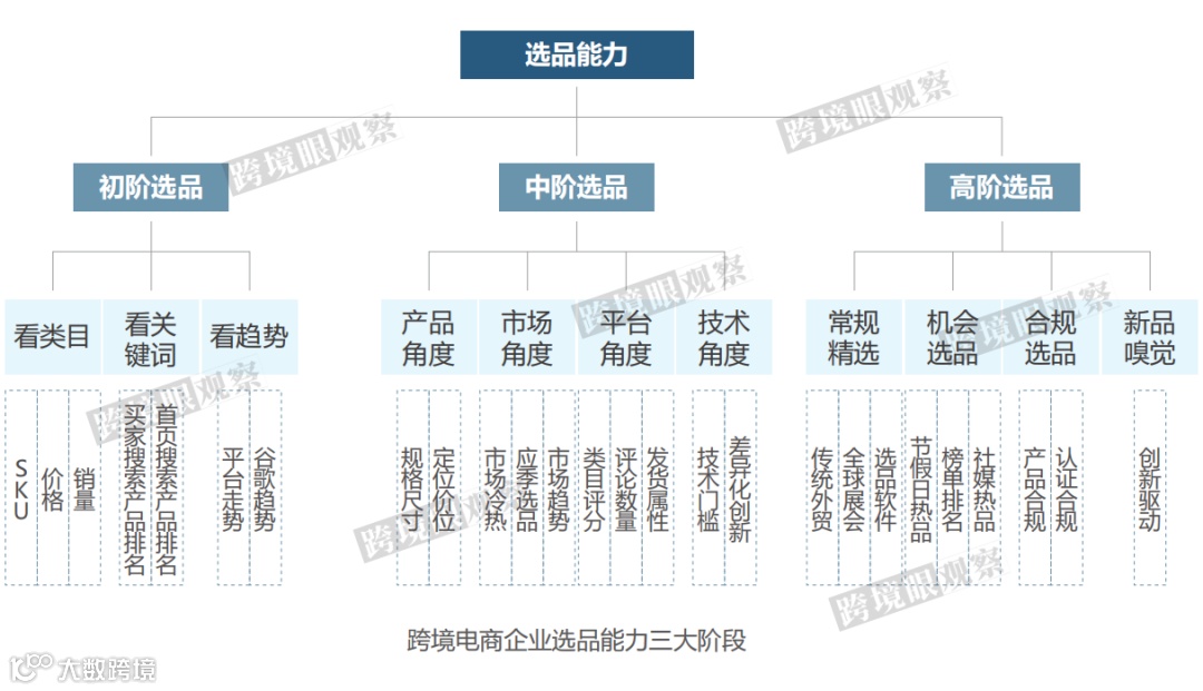 跨境电商行业发展到如今,不同阶段进入的卖家有不同的知识背景和经验构成,但是从选品能力上来看,仍有巨大差别,大体可划分为初阶、中阶和高阶三个阶段。