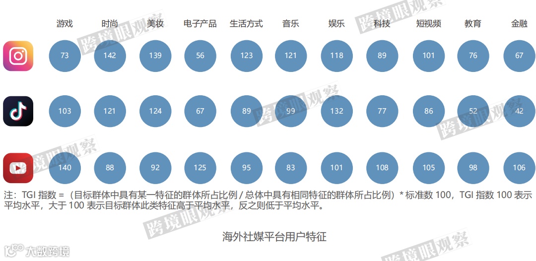 例如,Instagram用户更加关注时尚、美妆内容,对科技、金融、教育等内容关注不高;TikTok的用户更喜爱娱乐内容;而在YouTube上,游戏、电子产品、客户TGI(Target Group Index,目标群体指数)遥遥领先。所以,卖家可以根据自己品类的特性投放相应平台的网红。