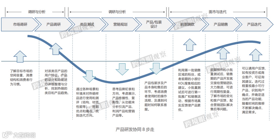 卖家与工厂协同配合开展产品研发与迭代,可以分为8个步骤,按照产品开发与价值的“微笑曲线”,产品开发两端的市场调研和产品迭代尤为重要。