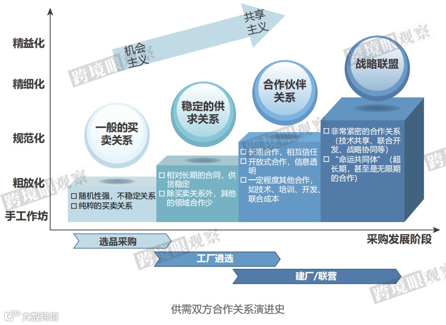 生态的多样性下,反过来也决定了供应链形态的多样性,选品进货、遴选工厂、入股工厂和自建工厂是跨境电商企业常见的供需情形,有关供应链的要求和管理侧重点也有所不同。