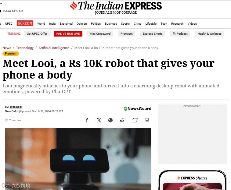交互机器人上线后的一个月,月活过亿的印度顶级知名媒体The Indian EXPRESS发布介绍类稿件。同一天,垂直科技博客TECHGIG也上线了简短的介绍内容,宣布该产品可在众筹平台购买的消息。两天后,月活超百万的娱乐资讯网站INVERSE同样推出类似文章。