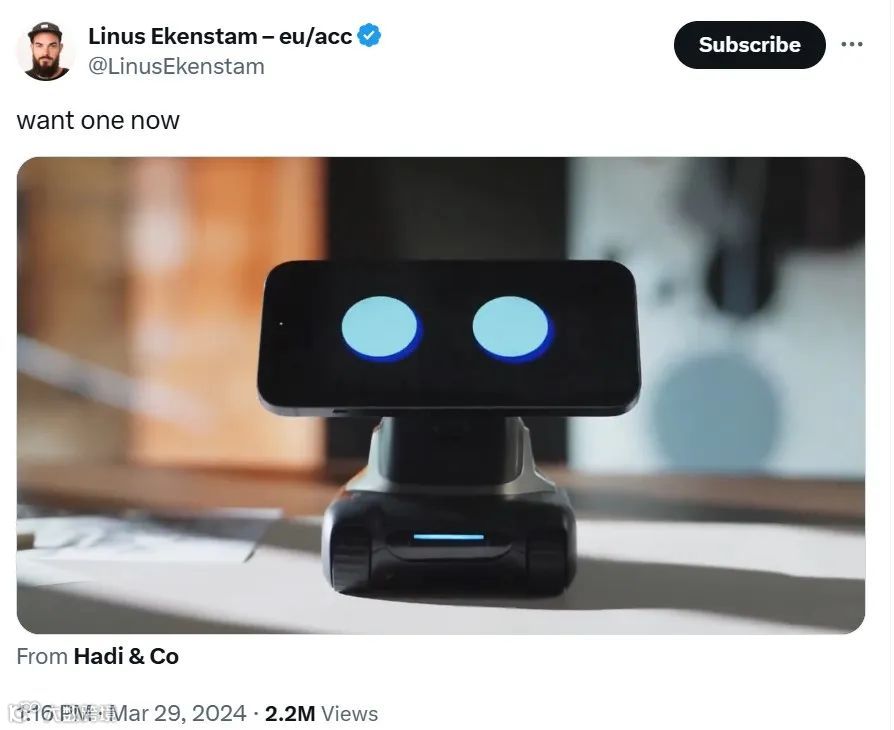聚焦人工智能领域的博主Hadi&Co发布一则LOOI Robot的介绍帖子被超过20万粉丝的Linus Ekenstam转发后引发讨论,最终还吸引了马斯克评论道:“pass the butter(递给我黄油)”,使得该款交互机器人的热度指数级提高,在社媒掀起一阵狂潮。