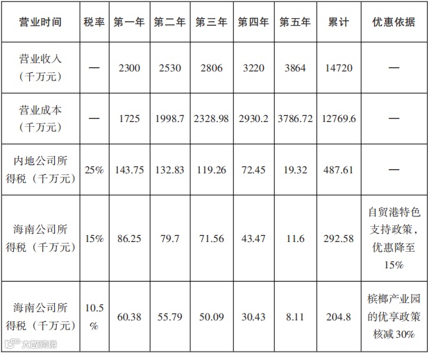 综上分析,以槟榔加工经营发展五年为基数,相较内地设厂,在海南自由贸易港设立分公司可累计节省所得税368万元,在万宁设立槟榔产业分公司可累计节省所得税533.6万元。