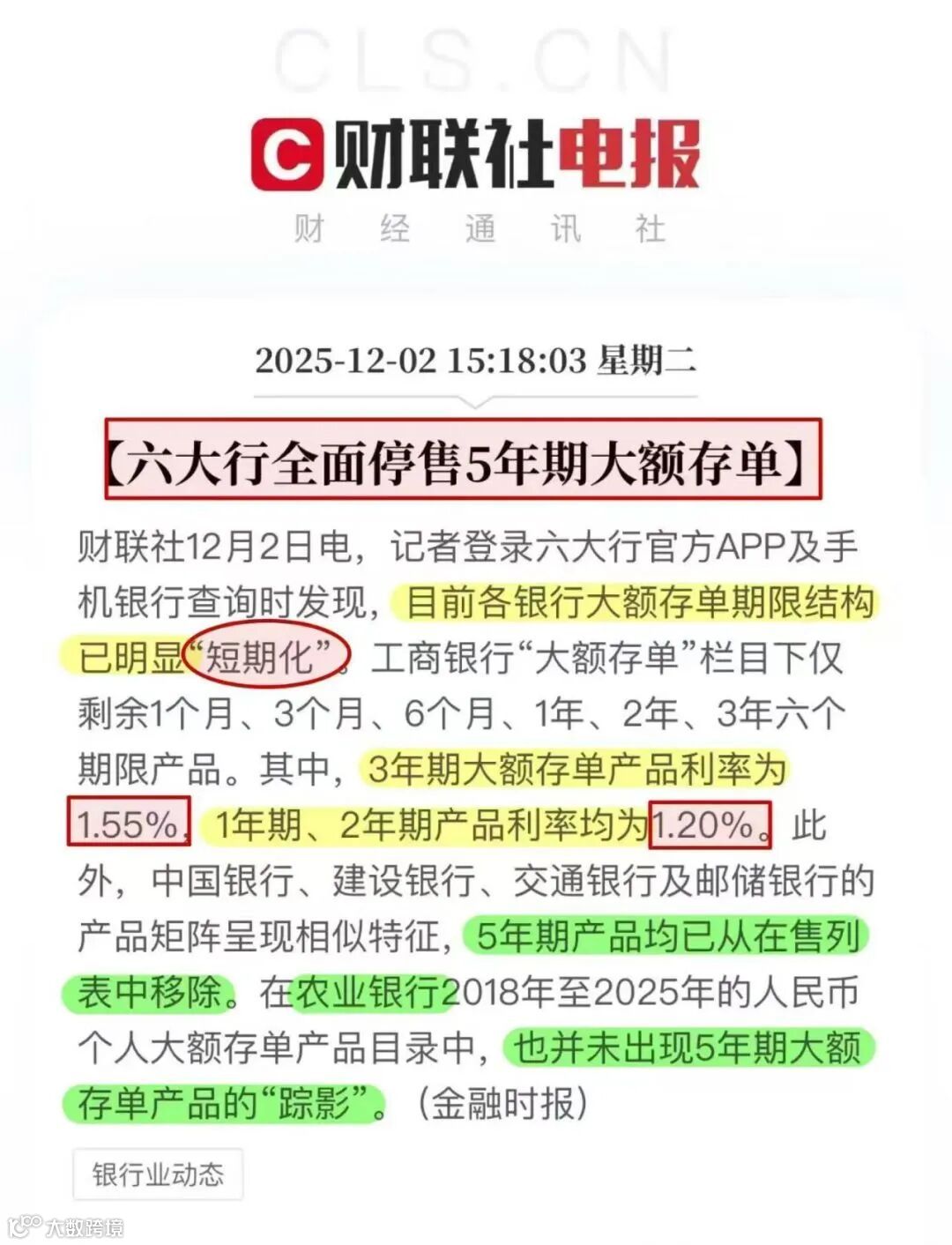 近期,多位客户关注到一条重要金融动态:多家大型银行已悄然下架五年期大额存单,仅保留年利率约1.5%–1.75%的三年期产品,且额度紧张;部分中小银行甚至同步取消了三年及五年期定期存款。