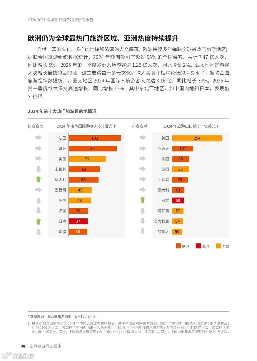 全球旅游业保持稳健增长,欧洲仍是最热门区域,亚洲热度持续提升。游客出行更注重价值、体验与赛事活动,汇率波动、深度体验及体育赛事成为重要驱动力。