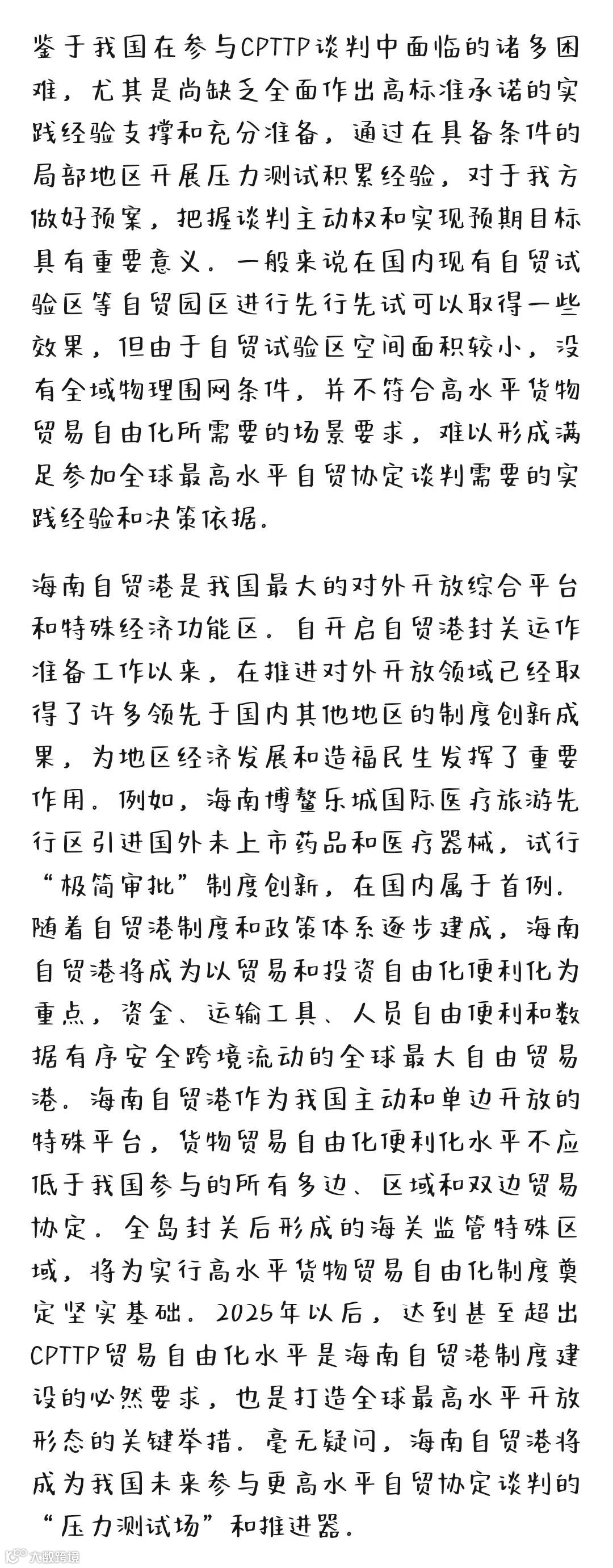 党的二十届四中全会对“十五五”时期对外开放工作作出科学部署,提出了“扩大高水平对外开放,开创合作共赢新局面”的总体要求。实施自由贸易区提升战略是我国推动区域合作的重大战略举措,也是我国扩大制度型开放的一项重点任务。面对单边主义和贸易保护主义行为加剧、多边主义和国际经济秩序遭受巨大冲击等严峻挑战,许多国家正在通过签署区域和双边自由贸易协定以寻求建立稳定的国际合作关系。这些新动向更加凸显我国持续构建高水平自贸区网络的重要性和紧迫性。未来五年,我国要在加入CPTPP、DEPA等高水平自贸安排方面取得实质性进展,仍需破解其现有成员要价高、我方作出全面承诺的准备不足、缺乏高标准贸易自由化实践经验支撑、边境后议题改革尚有较大差距等诸多谈判难题。海南自由贸易港建设作为我国主动扩大高水平对外开放的重大国家战略,随着2025年12月18日正式启动封关运作,即将进入贸易、投资、资金、人员、运输工具自由便利和数据安全有序跨境流动制度由初步形成走向成熟的关键时期,具备对接CPTPP等高标准国际经贸规则开展先行先试、积累经验的有利条件。“十五五”时期,着力将海南自由贸易港打造成为高标准贸易自由化政策的高质量“压力测试场”,对于协同推进自贸区和自贸港两大开放战略不断走向成熟具有十分重要的意义。
