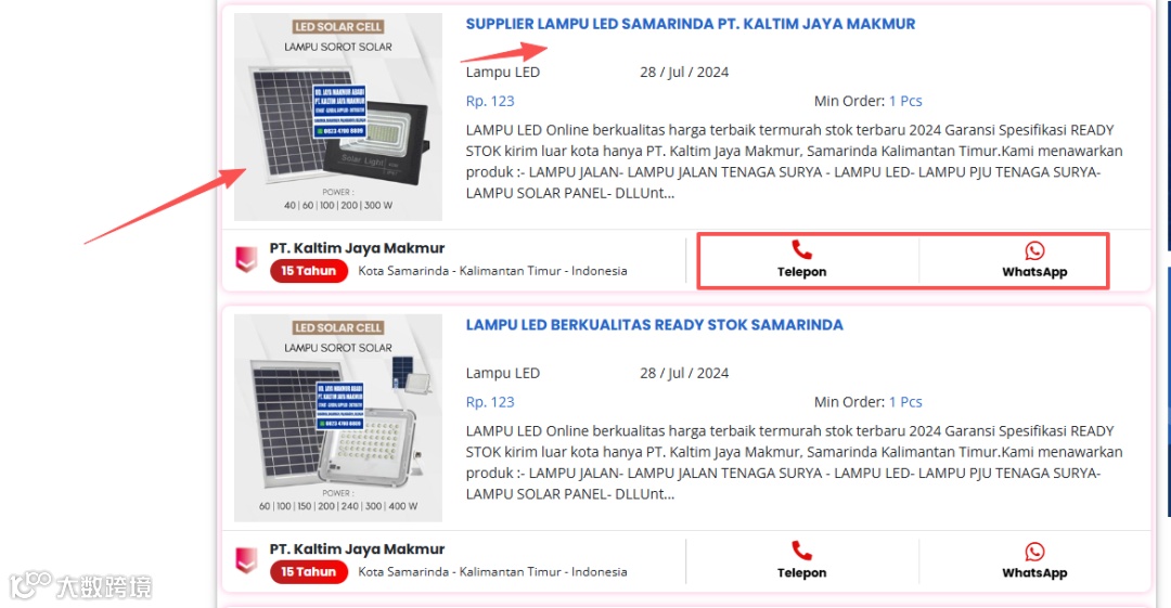 在首页搜索框输入目标产品关键词,平台将展示企业名称、产品图、类目价格(部分可见)以及电话、WhatsApp等联系方式预览。建议使用印度尼西亚语关键词进行搜索,结果数量可提升一倍以上。