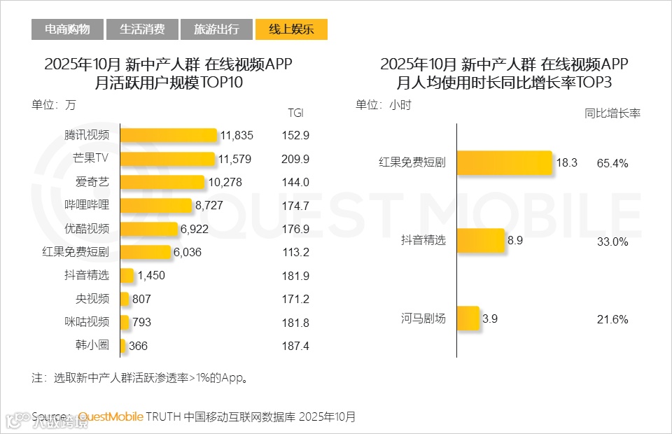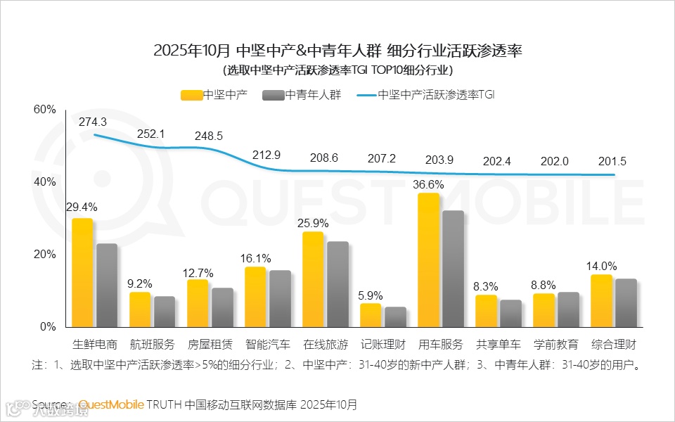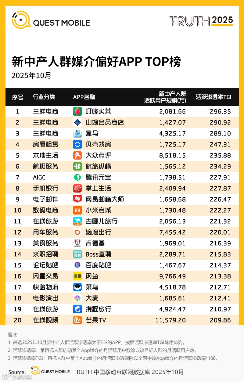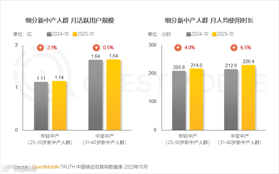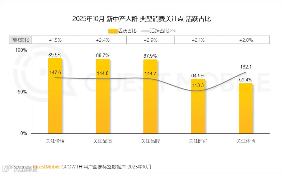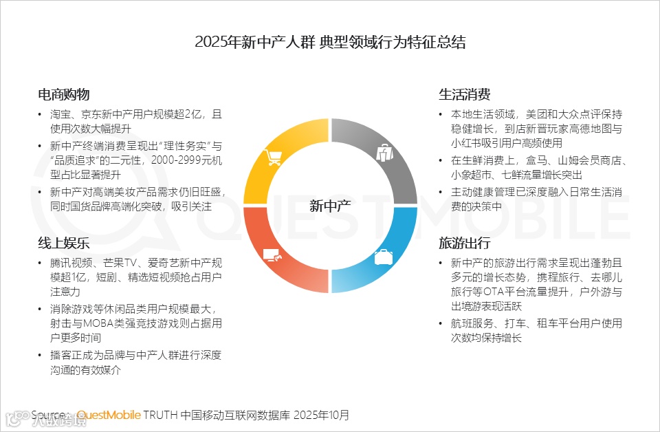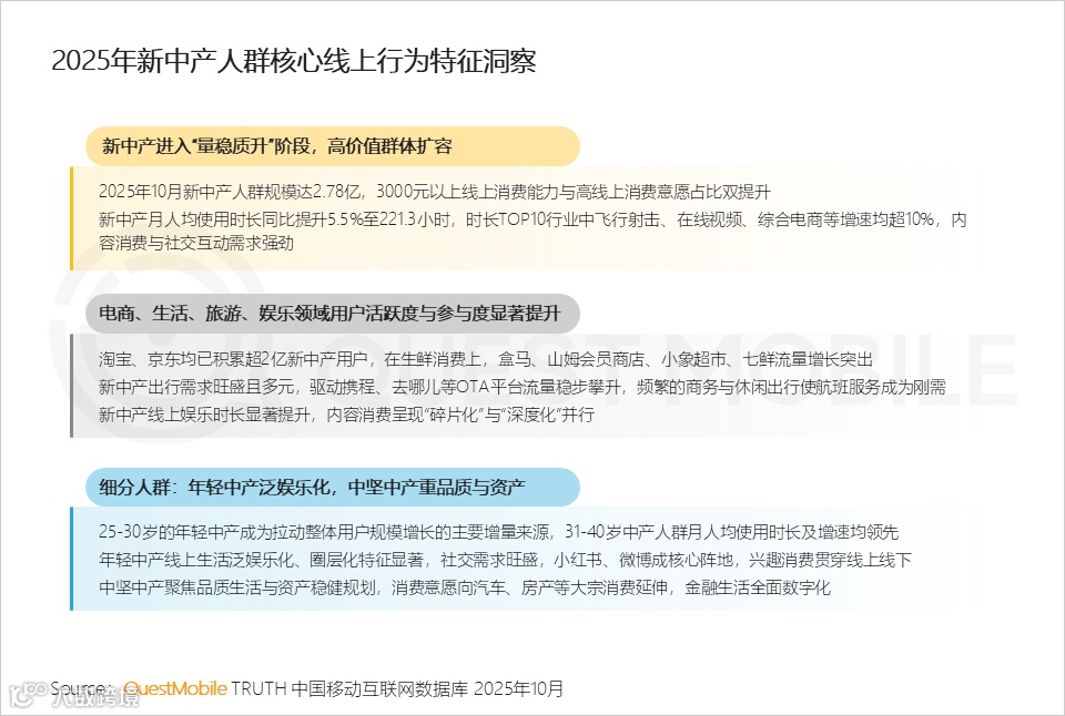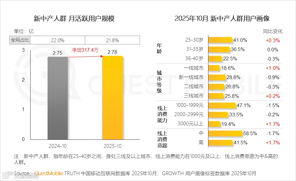 QuestMobile数据显示,截至2025年10月,新中产人群规模达2.78亿,同比净增317.4万。一线及三线城市双向延展,高消费力(线上月消费3000元以上)与高意愿用户占比分别同比提升1%和1.7%,高价值客群持续扩容。