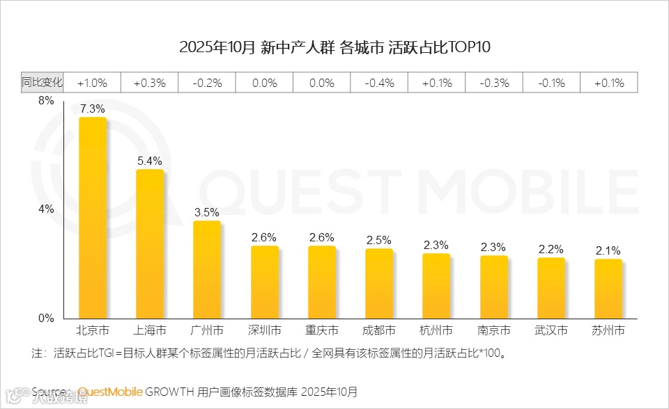 北京、上海、广州、深圳、重庆位居新中产用户活跃TOP5,占比分别为7.3%、5.4%、3.5%、2.6%和2.6%;其中北京同比增长1%,领先优势扩大。杭州、苏州等新一线城市的占比亦小幅提升[2]。