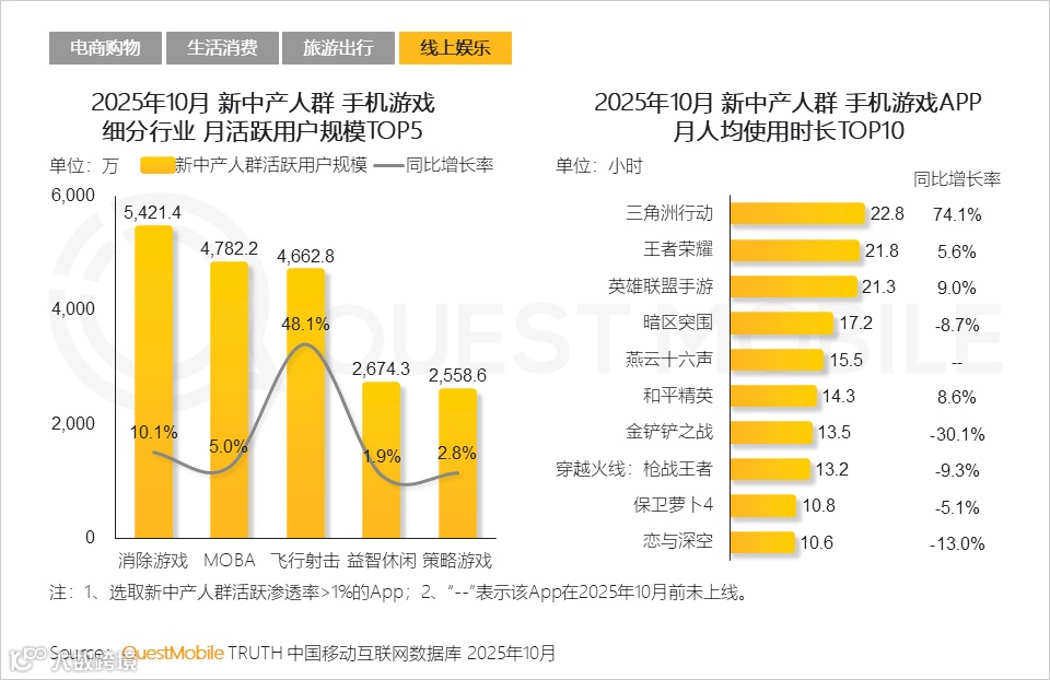 生鲜会员零售平台凭借“小时达”与品质保障精准契合需求;大众点评、航旅纵横、去哪儿旅行等生活出行类APP上榜[4]。腾讯视频、芒果TV、爱奇艺居在线视频活跃度前三;短剧与精选短视频正加速抢占碎片化时间[11]。飞行射击、MOBA类游戏主导用户时长,《三角洲行动》《燕云十六声》等新兴作品表现突出[12]。