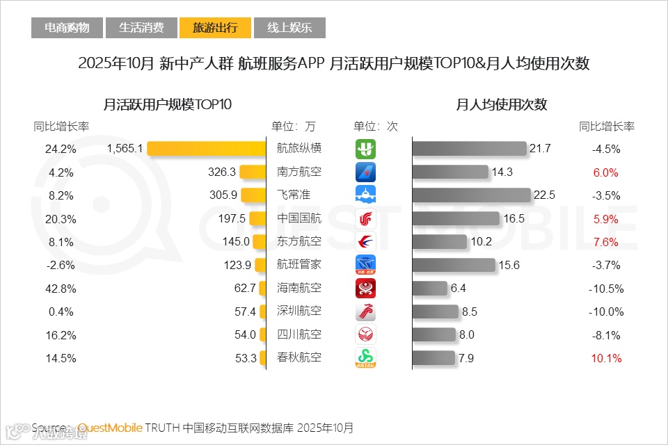 健身训练、饮食管理类APP增速居前;空气净化器、除螨仪、净水器等健康类智能小家电成主动配置热点[7]。旅游出行需求释放明显,携程、去哪儿OTA平台流量稳步攀升;航班服务平台成高频刚需,南航、国航等航司APP使用频次提升[8][9]。