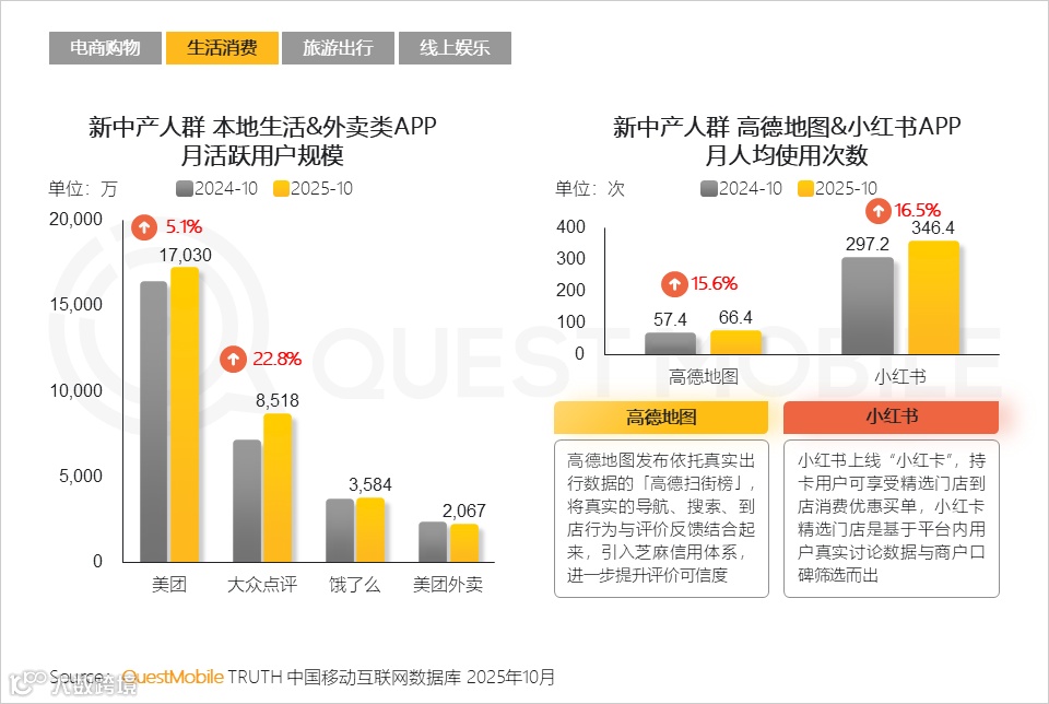 赫莲娜、雅诗兰黛、香奈儿等奢侈美妆品牌上榜,反映高端产品需求旺盛;同时国货品牌高端化突破显著,产品力持续增强[4]。本地生活方面,美团、大众点评流量持续增长,依托真实出行数据与内容讨论构建信任经济[5]。