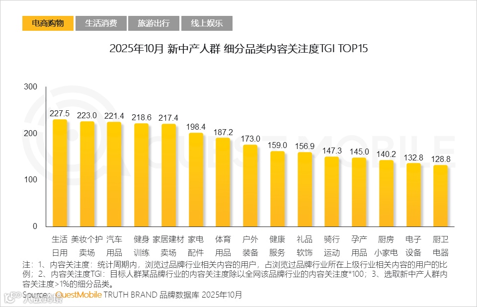 新中产消费升级呈现“质价比”导向,品牌与品质关注度持续加深,体验创新更易促动决策[7]。生活日用、美妆个护、汽车为TOP3关注品类;健身、骑行成标志性生活方式;对家居家电、智能健康设备投入意愿强[3]。盒马、山姆会员商店新中产用户规模同比激增44.8%、38.9%。