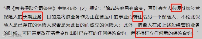 “除非法庭另有命令,否则清盘人必须继续经营保险人的长期业务,目的是将该业务作为正在营运中的事业而转让给另一个保险人。”