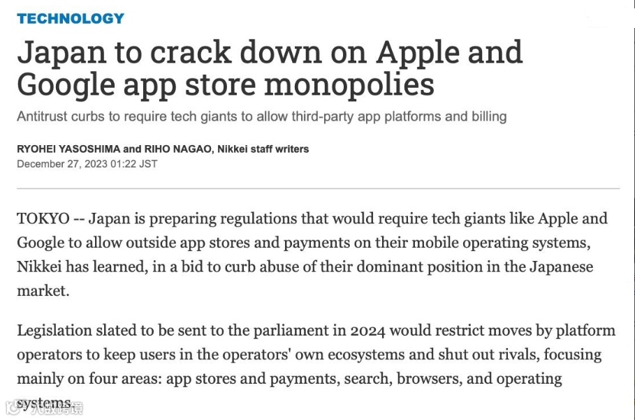 据悉,日本当局从 2020 年起开始调查苹果、谷歌、亚马逊、Meta 等公司的“反垄断问题”,2023 年相关监管机构声称“完成了研究”,并宣布“苹果和谷歌主导了移动平台应用程序市场,造成了垄断现象”。