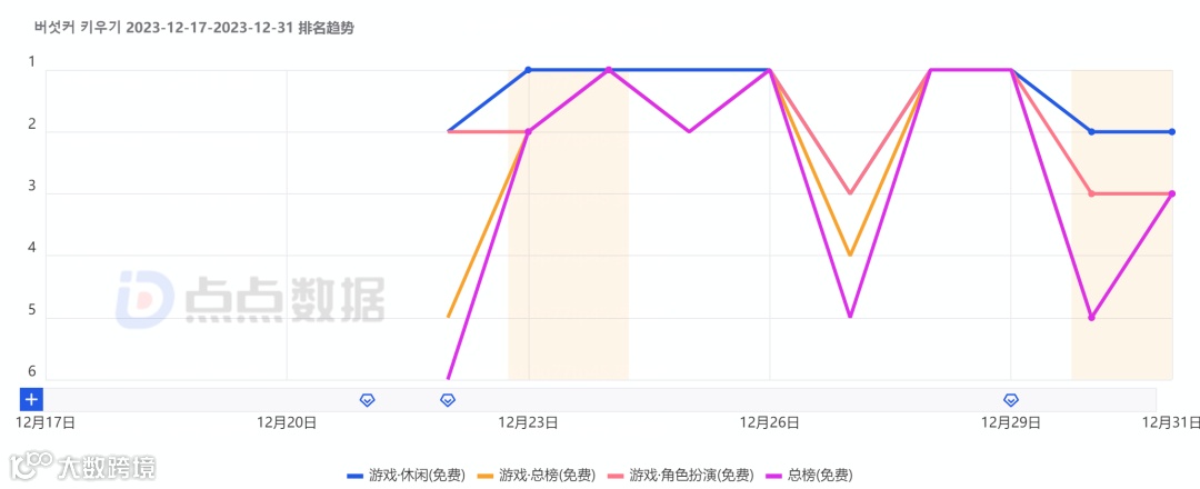 12月下旬,由4399旗下海外发行品牌Joy Net Games发行的《버섯커 키우기》(菇勇者传说韩服版本)正式上线公测。根据点点数据统计,游戏上线当日便冲进双平台免费总榜前十,并于上线第三天登顶App Store韩国免费总榜。
