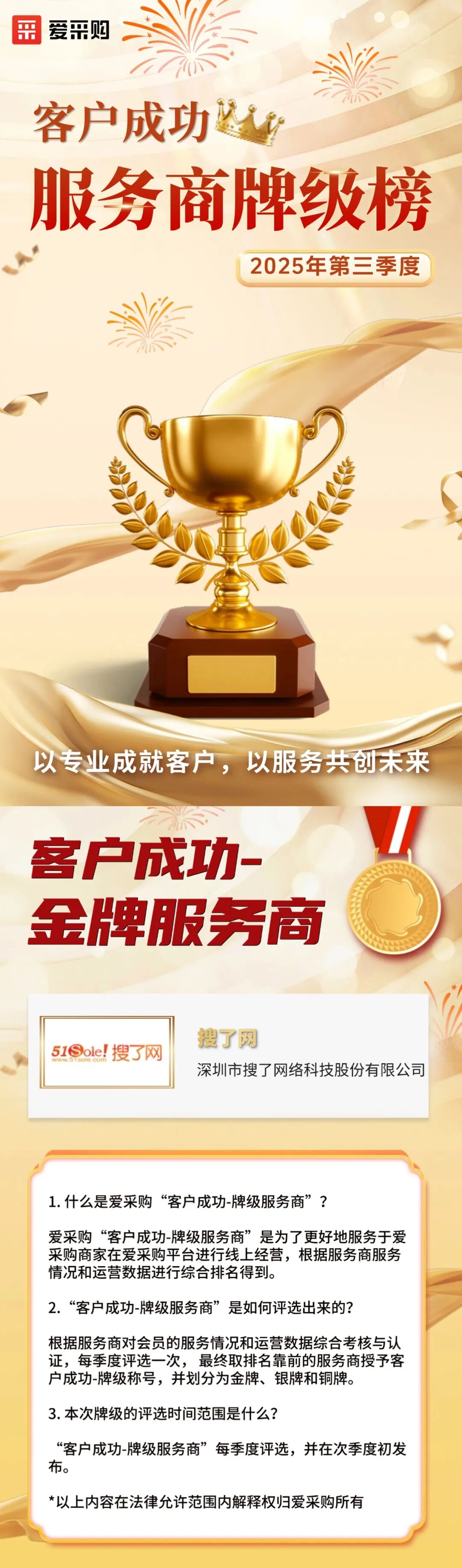 喜报丨再度加冕!搜了网蝉联百度爱采购「金牌服务商」殊荣!