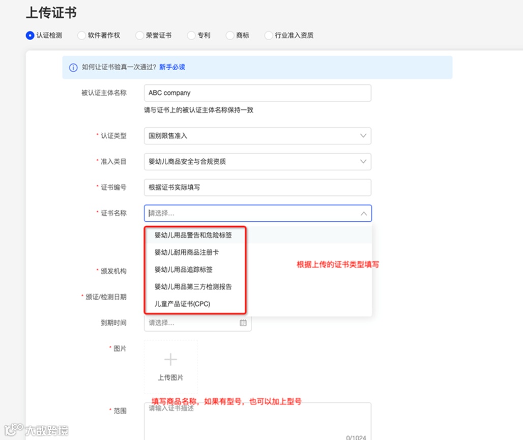 注意事项:仅管理员账号(主账号)可上传商品相关资质。