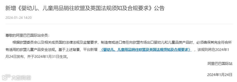 近日阿里巴巴国际站发布新增《婴幼儿、儿童用品销往欧盟及英国法规须知及合规要求》公告,公告如下: