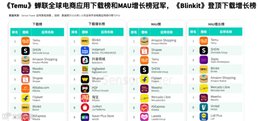 Temu的筹码是“极致低价+极致流量”。据Sensor Tower刚出炉的数据:到2025年10月,全球累计下载量冲破12亿,连续三年霸榜购物类下载第一;今年前十个月,同时还包揽下载增速和月活增速双冠。今年的黑五,更是被它拉长成“两个月低价马拉松”,把传统旺季的节拍器彻底打乱。