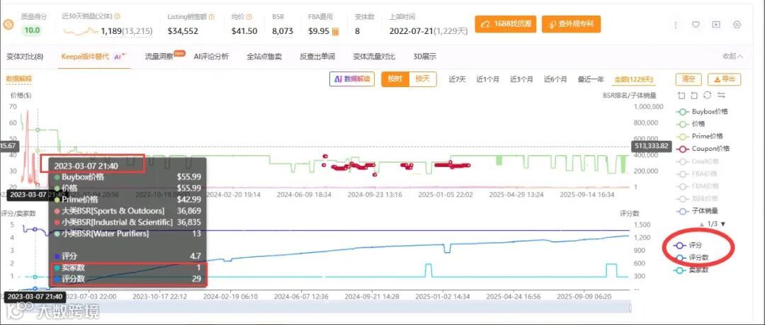 通过KEEPA数据观察,某竞品链接评论数从1条增至29条,进一步下拉可见真实文字评论421条,无文字评论839条,总增长速度远超自然节奏——一年内日均新增约1条评论,属非常规增长模式。