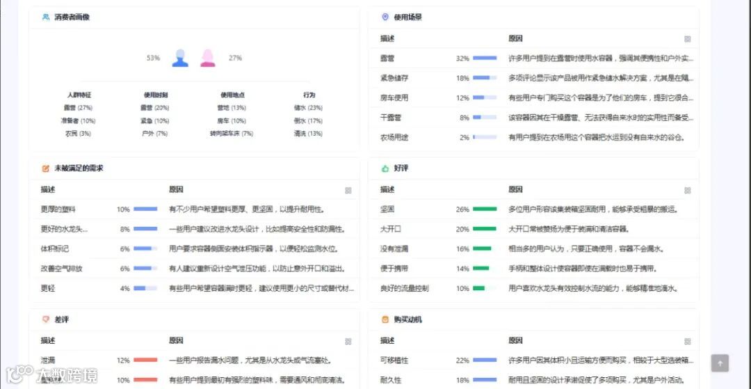 从消费者画像分析,目标用户以男性为主,核心使用场景为露营储水,少量用于农业用途。需重点关注功能满足度及差评反馈点,优化产品体验。