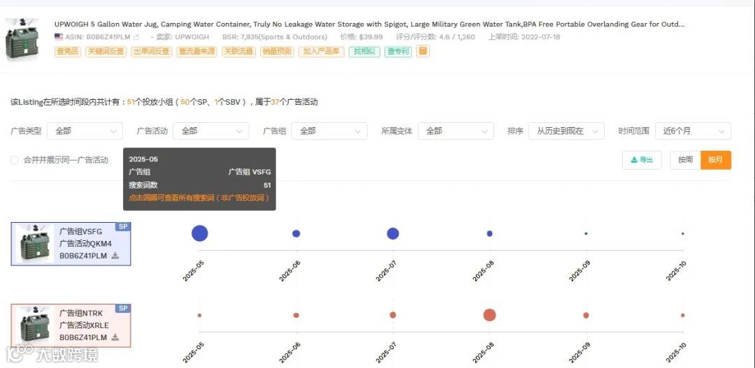 数据显示竞品长期占据SP广告首页位置,累计投放164个SP广告,表明其卡位能力强。5–7月为广告活跃高峰期,对应市场需求旺季。