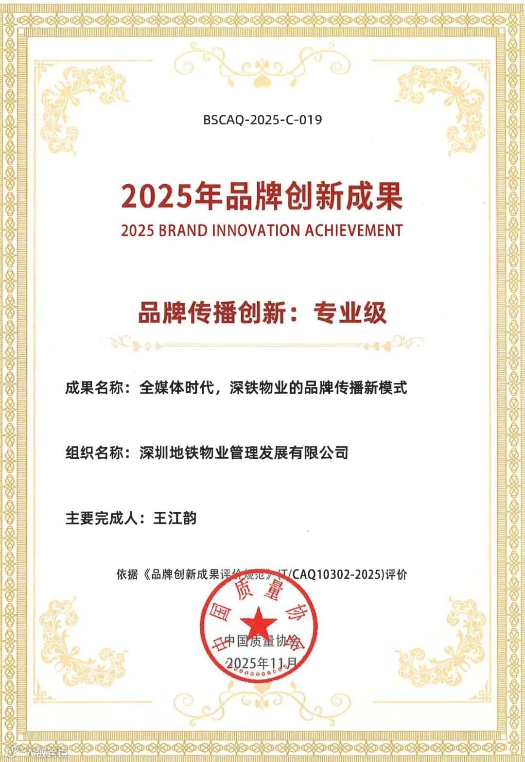 在2025年品牌创新大会中,深铁集团报送的品牌案例《全媒体时代,深铁物业的品牌传播新模式》从全国数百个申报案例中脱颖而出,获评“中国2025年企业品牌创新成果奖(专业级)”。此次获奖,标志着深铁集团在全国品牌创新成果领域实现“零”的突破。