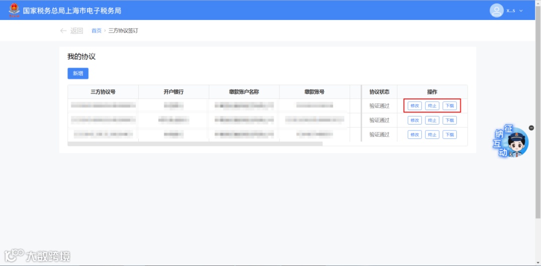 2. 可点击【终止三方协议】跳转处理,变更完成后需重新签订三方协议[k]。