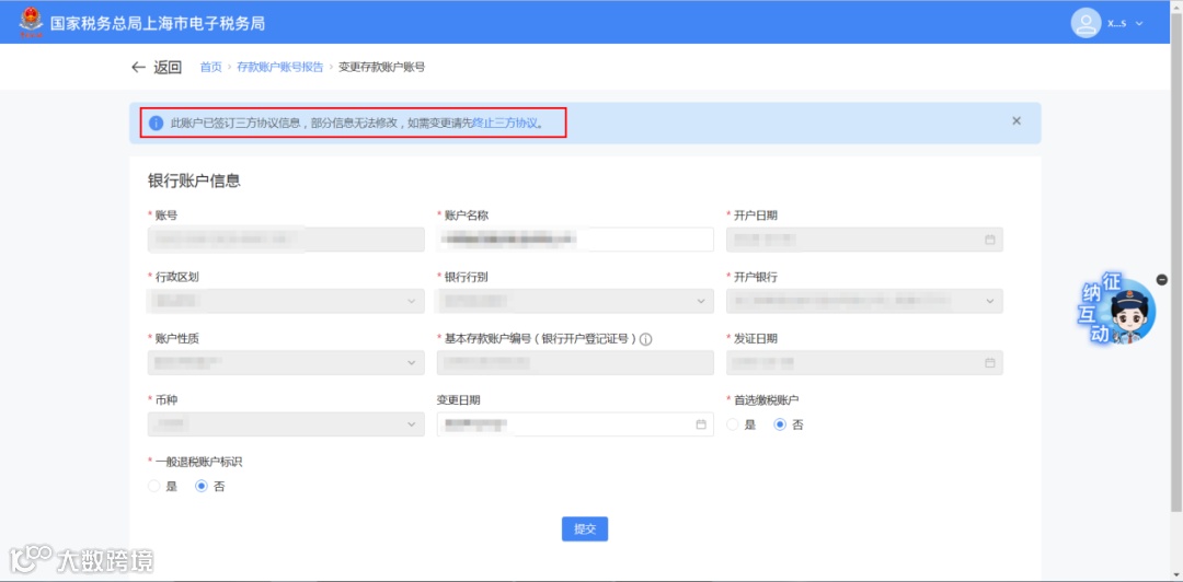 1. 系统将提示:“此账户已签订三方协议信息,部分信息无法修改,如需变更请先终止三方协议”[k]。