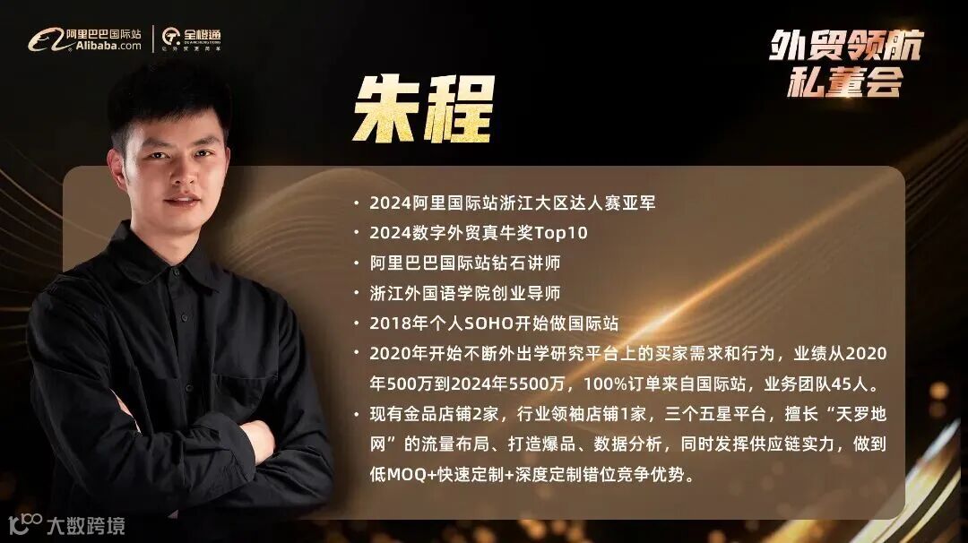 阿里国际站钻石讲师、2024 阿里国际站浙江大区达人赛亚军,从个人 SOHO 起步,4 年把外贸业绩从 500 万做到 5500 万(100% 订单来自阿里国际站),还手握多家金品店铺、五星平台。他不教 “纸上谈兵”,只分享一线闯出来的 “增长硬方法”。