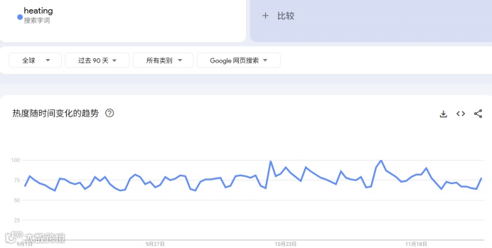谷歌趋势数据显示,“heating”一词在过去90天热度达75—100之间,随着北半球进入冬天,天气愈发寒冷之下,“british gas november heating warning”话题热度飙升2300%,“heating face mask”、“blanket”、“Intelligent thermostat”(智能恒温器)等其他相关取暖话题热度也不断飙升。