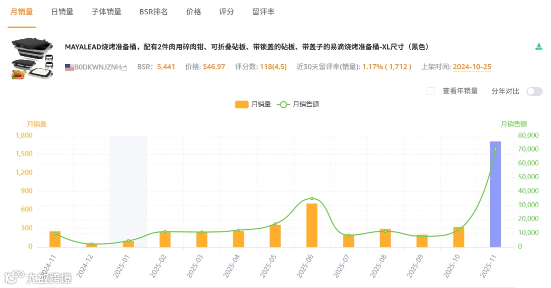 烧烤作为欧美主流社交活动,相关产品市场需求稳定。该产品功能实用,利润可观,暂无明显专利壁垒,新品成长潜力显现,市场竞争环境正常,中国卖家占比较高,适合有供应链资源的卖家小批量试水,逐步验证市场反馈。
