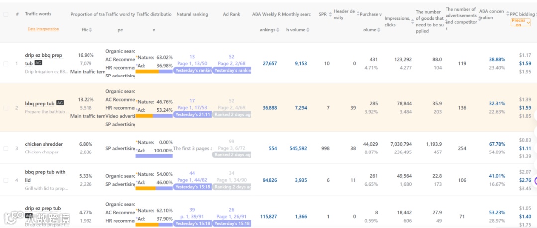 反查结果显示,该产品主要依赖广告引流。核心流量词“drip ez bbq prep tub”和“bbq prep tub”的PPC竞价均为1.59美元,“chicken shredder”关键词PPC竞价为1.11美元,关键词竞争集中于付费推广。