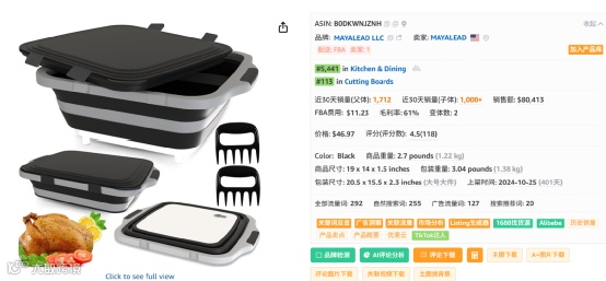 据卖家精灵数据显示,该产品在美国站点上架,拥有2个变体,已运营401天。历史月销量稳定,近30天父体销量突破1,712单,市场表现强劲。