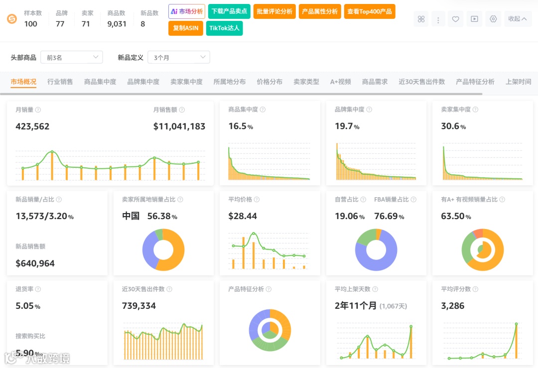 市场数据显示,在100个样本中,新品数量为8个,新品销量占比3.2%,商品集中率16.5%,品牌集中度19.7%,卖家集中度30.6%,中国卖家占比达56.38%,类目退货率为5.05%。整体市场格局分散,新品有机会切入,竞争环境相对健康。
