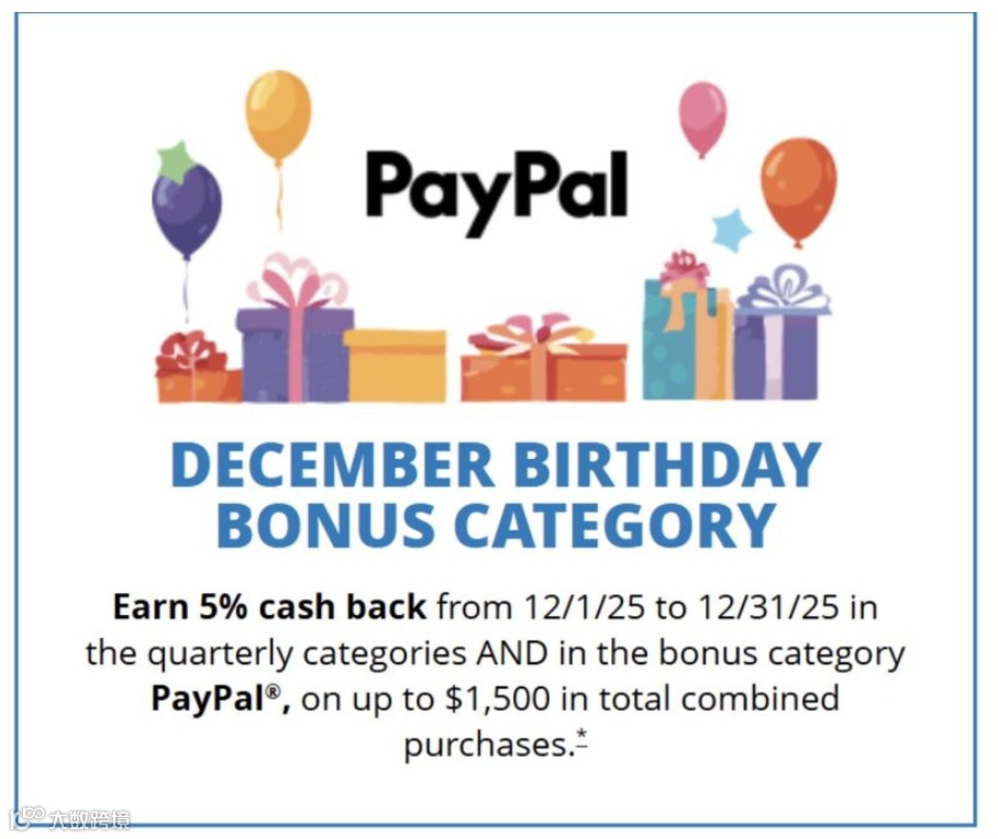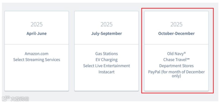 2025年11月更新:自12月1日至12月31日,使用 PayPal 消费可享受 Chase Freedom Flex 卡 5x 积分奖励。该类别已自动激活,无需重新设置,用户只需将 PayPal 设为默认支付方式即可参与。单季消费满 $1,500 封顶。