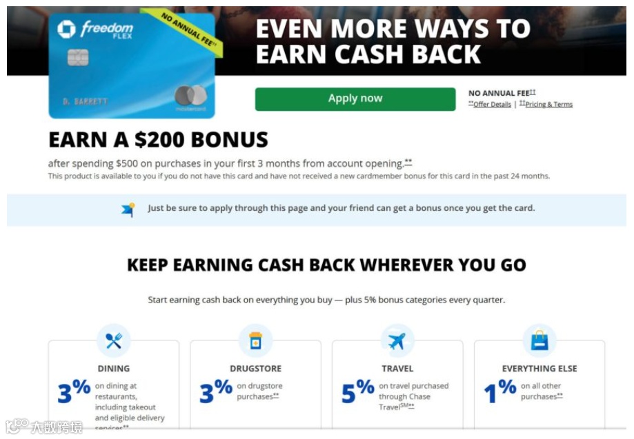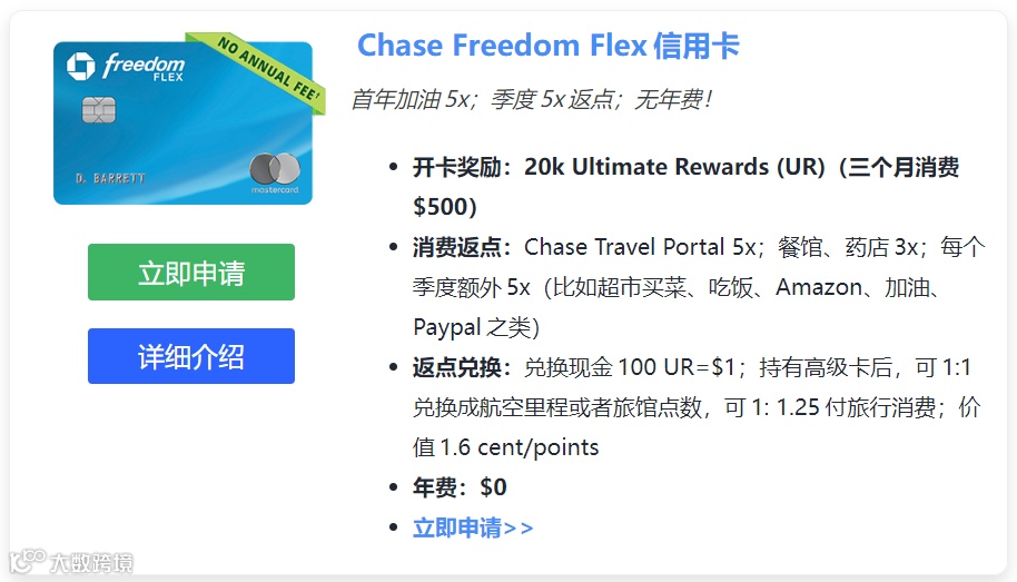 Chase Freedom Flex 目前已重新上架,开卡奖励维持 20,000 Ultimate Rewards® 积分(可兑换 $200)。该卡每季度提供 5x 积分类别,配合餐饮和药店消费享 3x 回报,长期持有性价比高。UR 积分可通过 Chase Sapphire Preferred 或 Reserve 转移至航空或酒店伙伴,提升兑换价值。