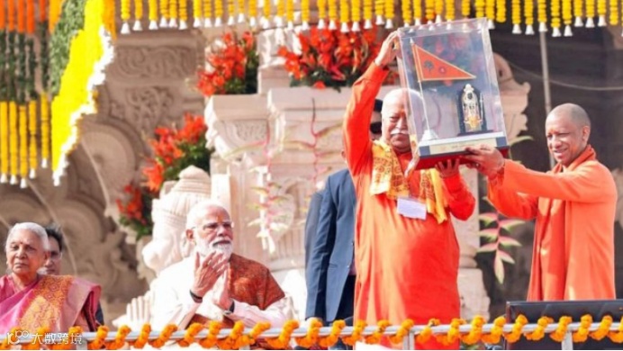 北方邦首席部长阿迪亚纳特在阿约提亚的毗湿奴神庙举行的旗帜升起庆典上,向国民志愿服务团(RSS)最高领袖巴格瓦特致以祝贺。图源:ANI